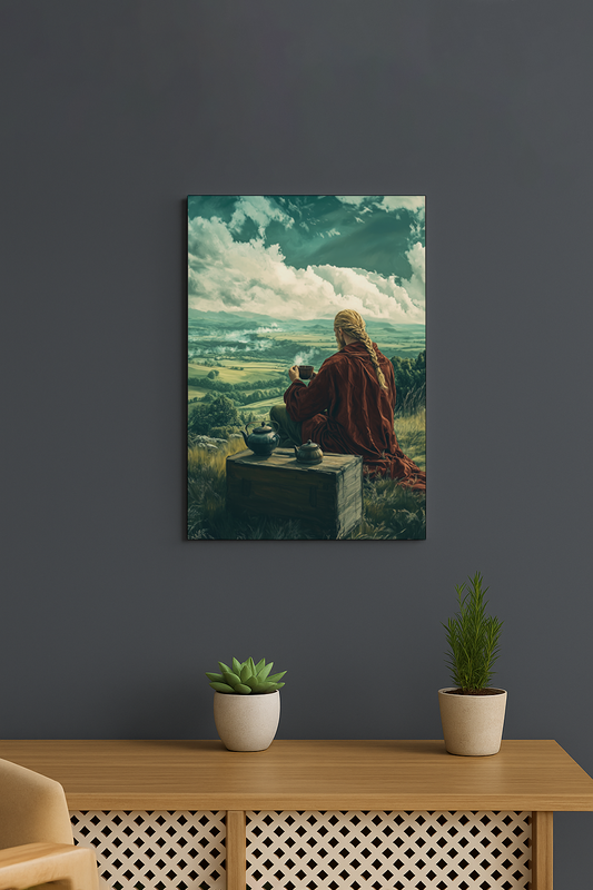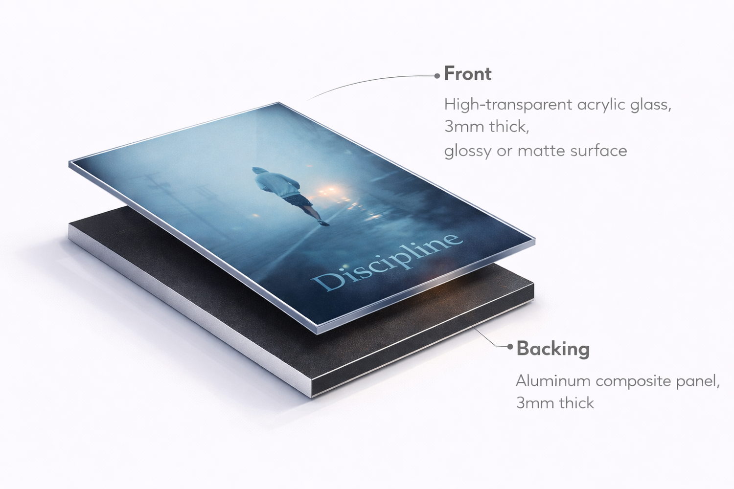 This means the artwork is printed in high resolution on premium photo paper, sealed behind a glossy acrylic glass layer and mounted on a durable aluminum backing.