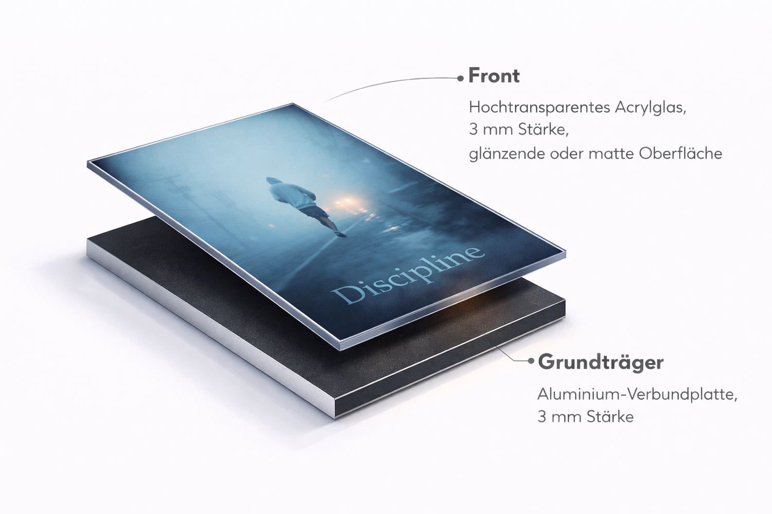 Das bedeutet, dass das Kunstwerk in hoher Auflösung auf hochwertigem Fotopapier gedruckt, hinter einer glänzenden Acrylglasschicht versiegelt und auf einer robusten Aluminiumrückseite montiert wird.