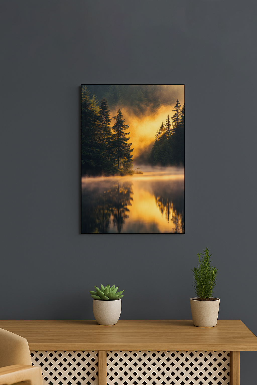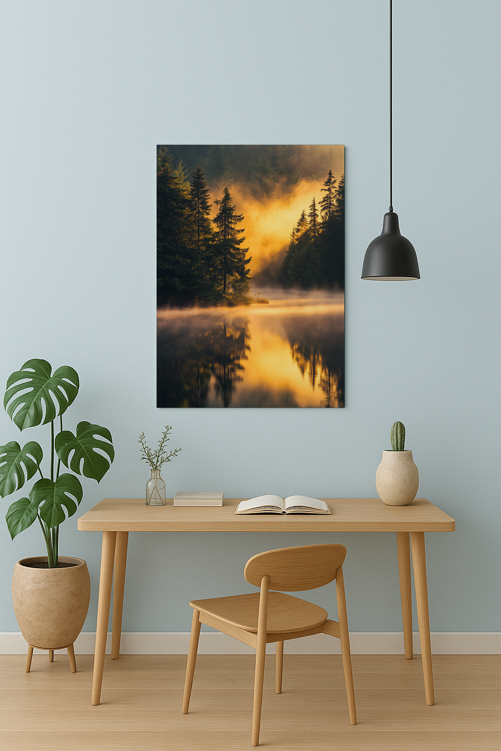 Verleihen Sie Ihren Räumlichkeiten mit dieser friedvollen Wald- und Seelandschaft Ruhe und natürliche Schönheit. Perfekt, um zu Hause oder im Büro eine entspannende Atmosphäre zu schaffen.