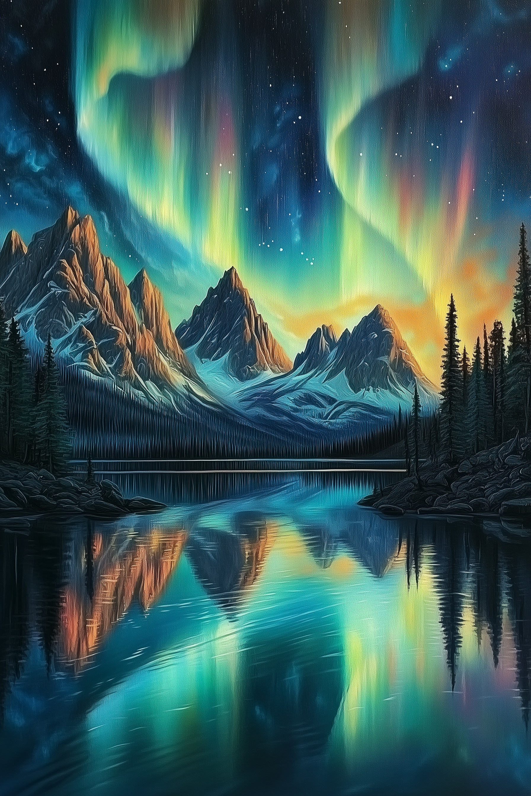 Erleben Sie den ätherischen Tanz der Polarlichter über einer unberührten nordischen Wildnis. Diese eindrucksvolle Landschaft fängt die stille Majestät des arktischen Himmels ein, wo smaragdgrüne Polarlichter über unberührter Natur schimmern. Die Komposition strahlt trotz des kühlen Klimas eine intime Wärme aus – ein Zufluchtsort für alle, die in der Erhabenheit der Natur Ruhe suchen.