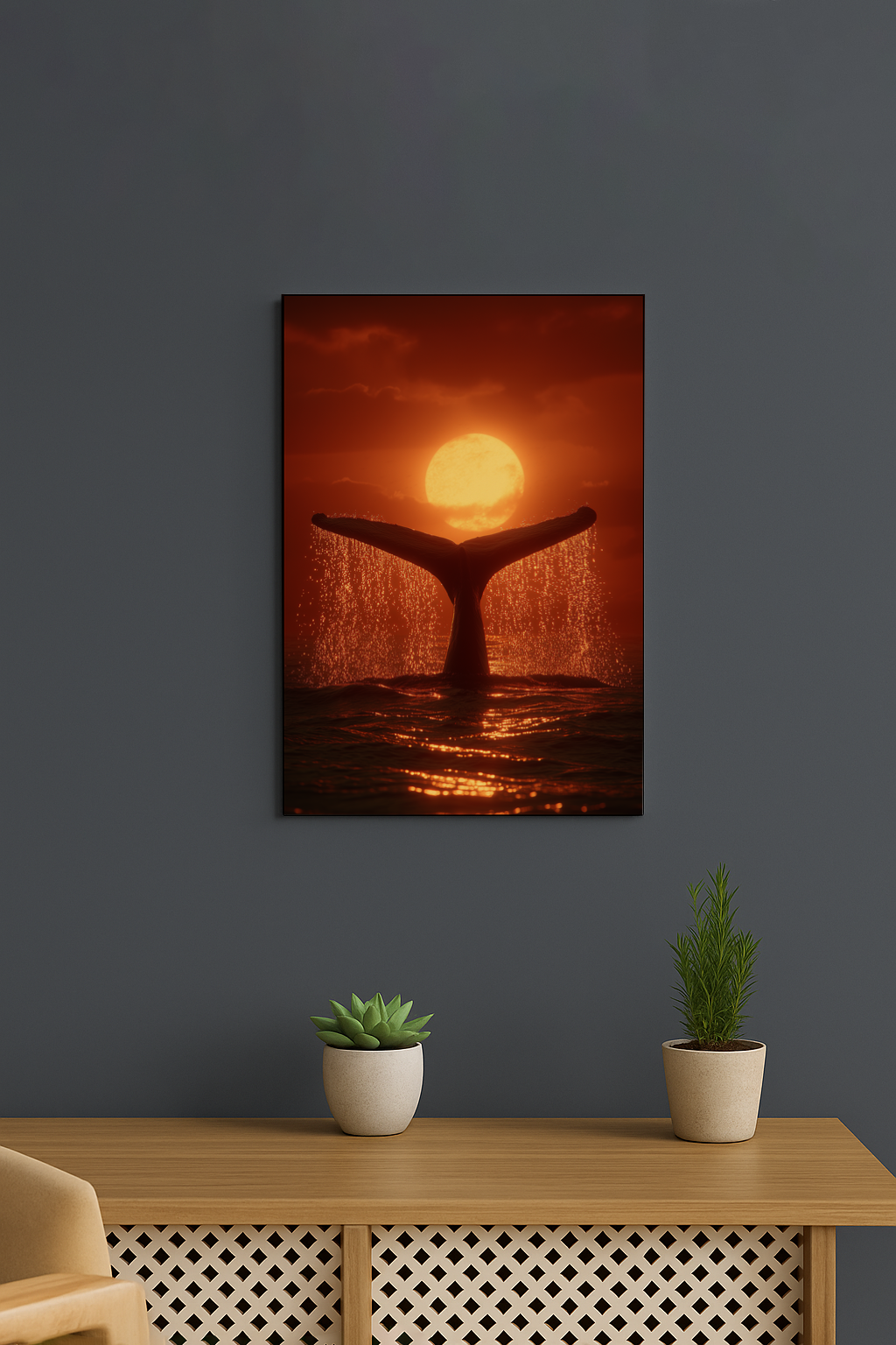 Capture the serene beauty of an ocean sunset with this stunning poster. Featuring a majestic whale’s tail gracefully emerging from the water.