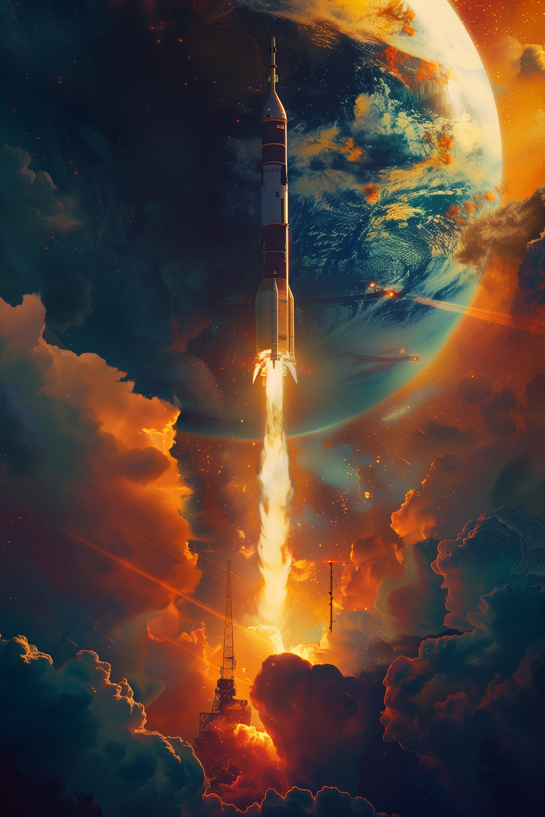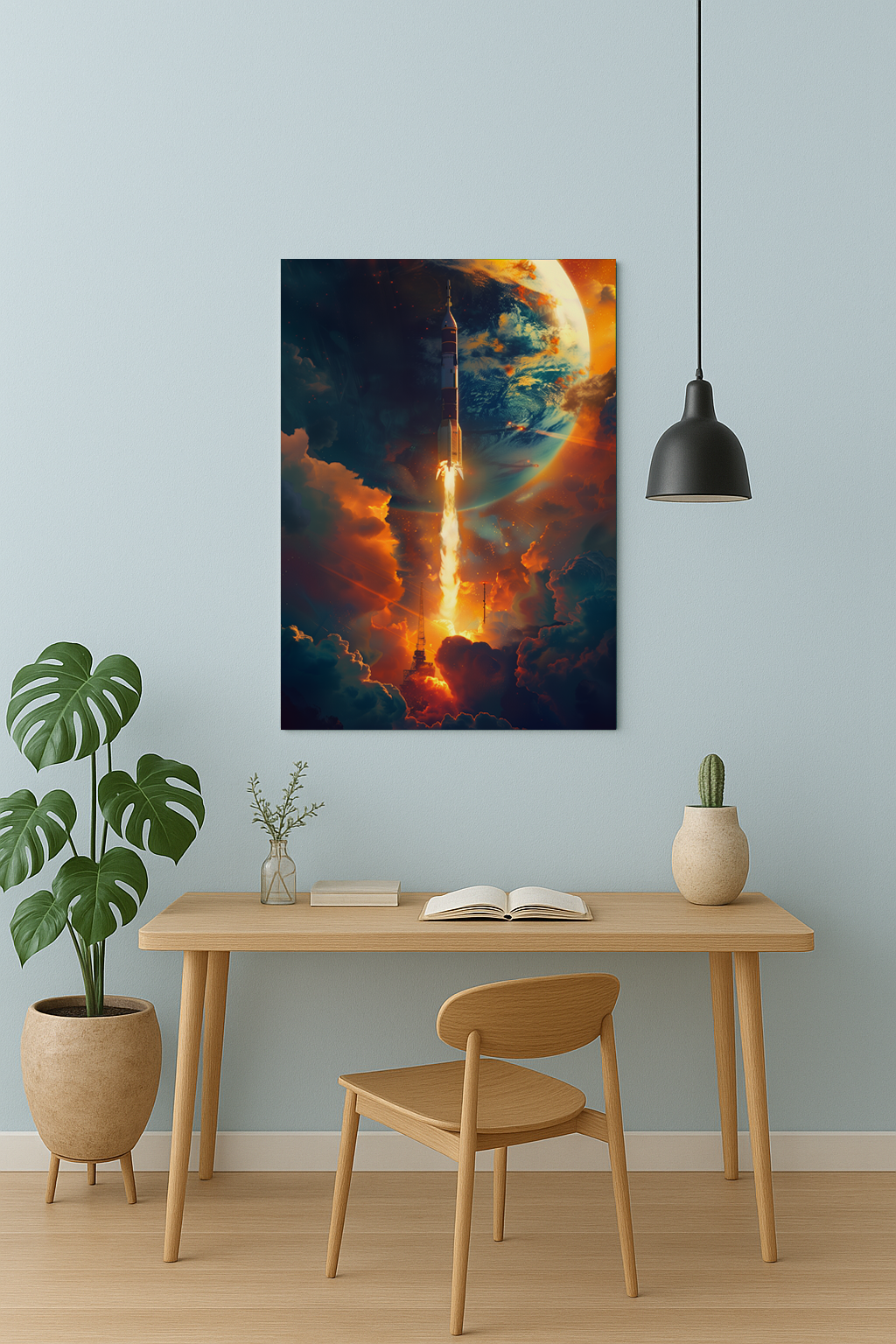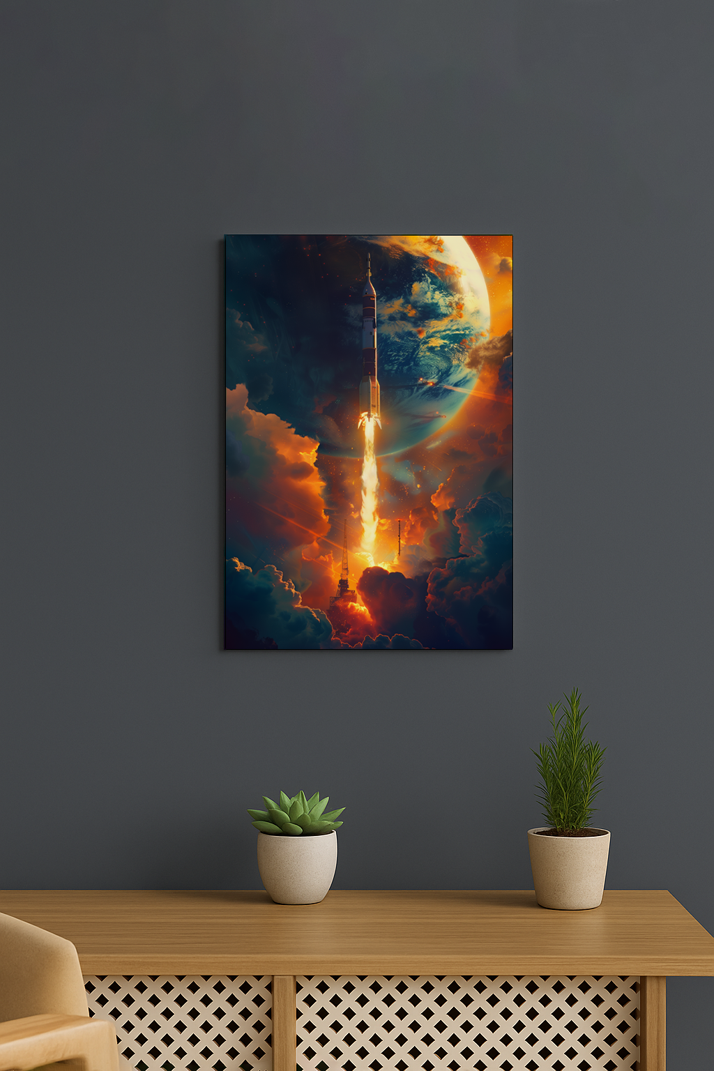 An epic cinematic sci-fi artwork capturing a rocket breaking through storm clouds into the vastness of space. Dramatic orange and blue lighting, towering clouds, and a looming planet create a powerful sense of scale, ambition, and exploration. A bold statement piece for modern interiors, offices, or creative spaces.
