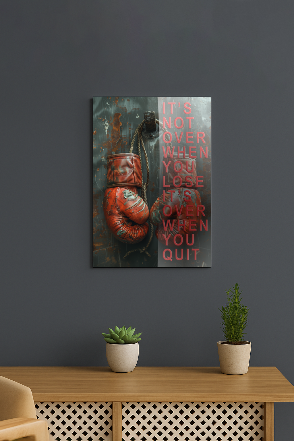 Vintage boxing gloves hung on a wall—a powerful reminder that quitting is the only real defeat. This gallery piece celebrates perseverance and the strength to keep moving forward, no matter the obstacles.