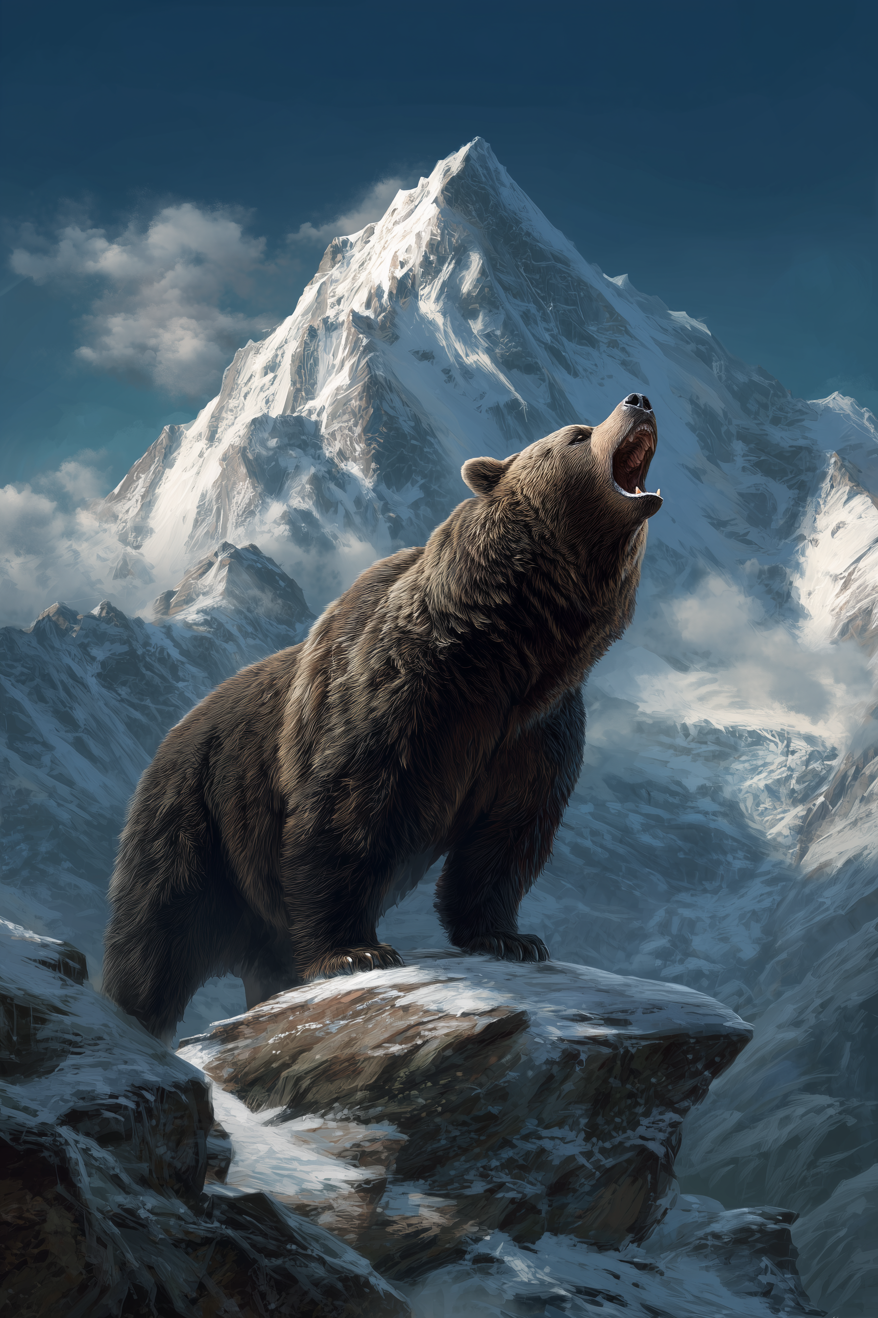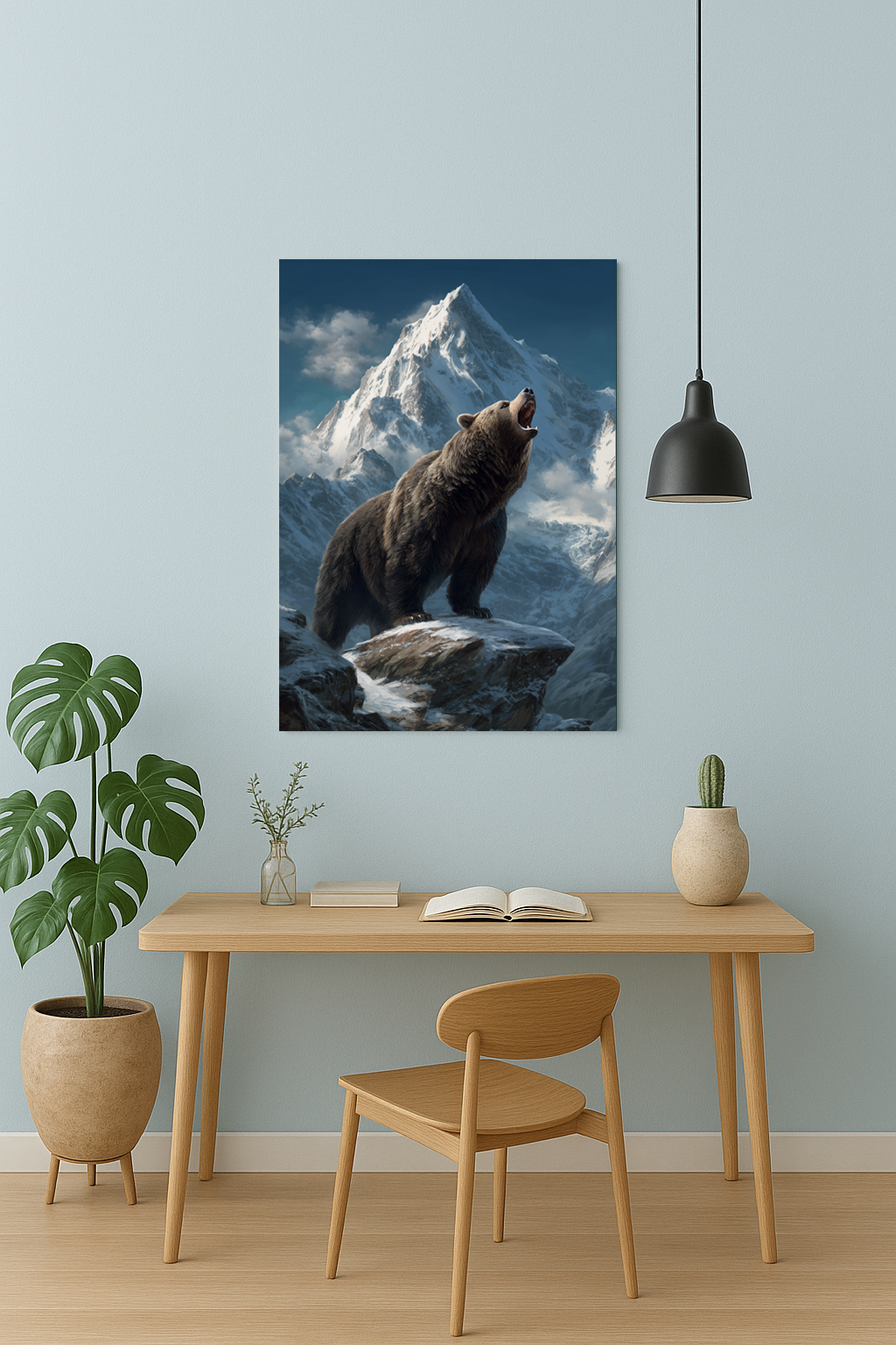 This striking poster features a majestic grizzly bear standing proudly atop a hill, embodying raw power and resilience. Set against the backdrop of a towering mountain, the image evokes a profound sense of strength and natural grandeur.